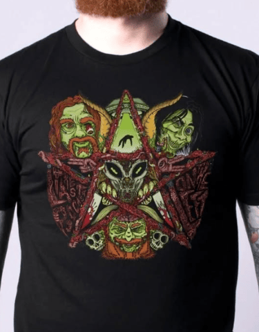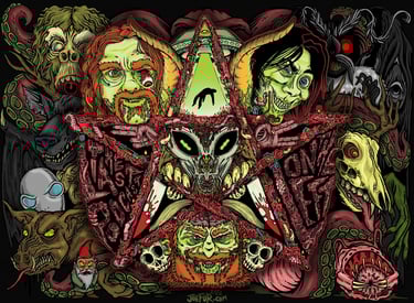 This project started as a t-shirt design for USA based Last Podcast on the Left's online merch shop, which once printed was picked up by publisher Z2 Comics. Z2 publishes the 'Last Comic Book on the Left', an independent collaboration with the long-running true-crime based podcast and proposed a larger version of the shirt image for a double page spread (above).