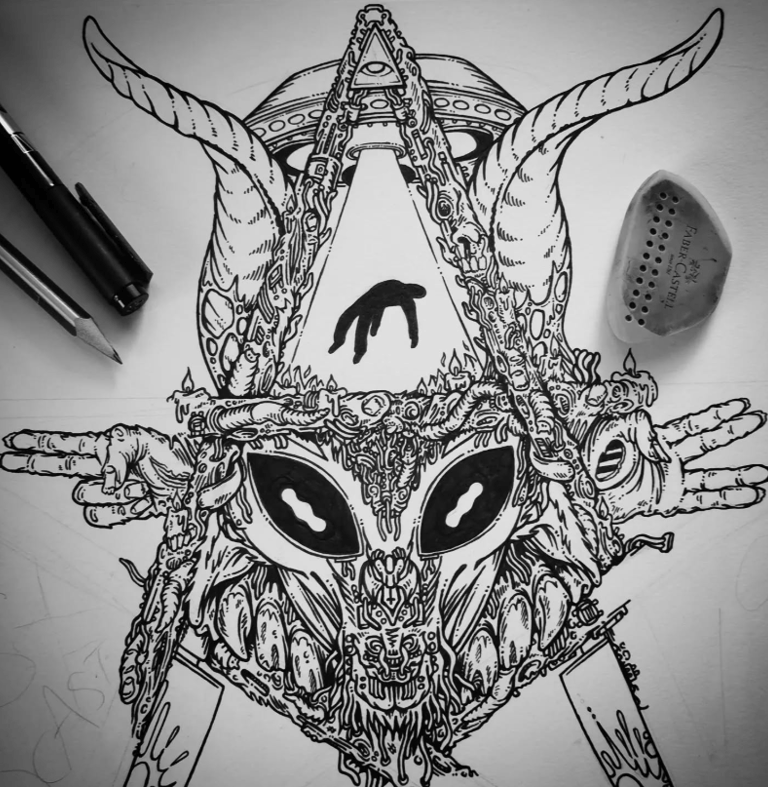 The design was created using pigment ink on 200 gsm paper and digitally coloured using a variety of professional brushes. The drawing was then developed into a complex animation to be used on social media and sent to both the podcast and Z2 Comics (below)