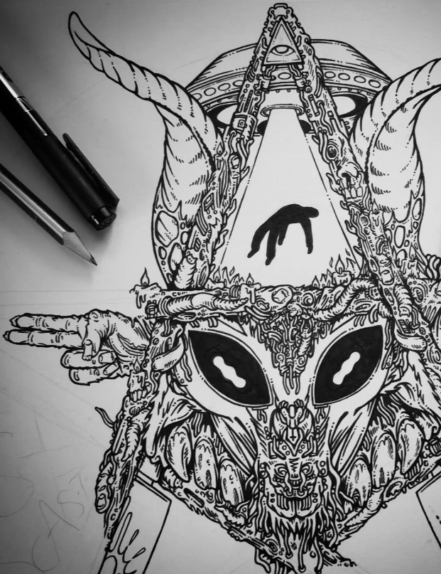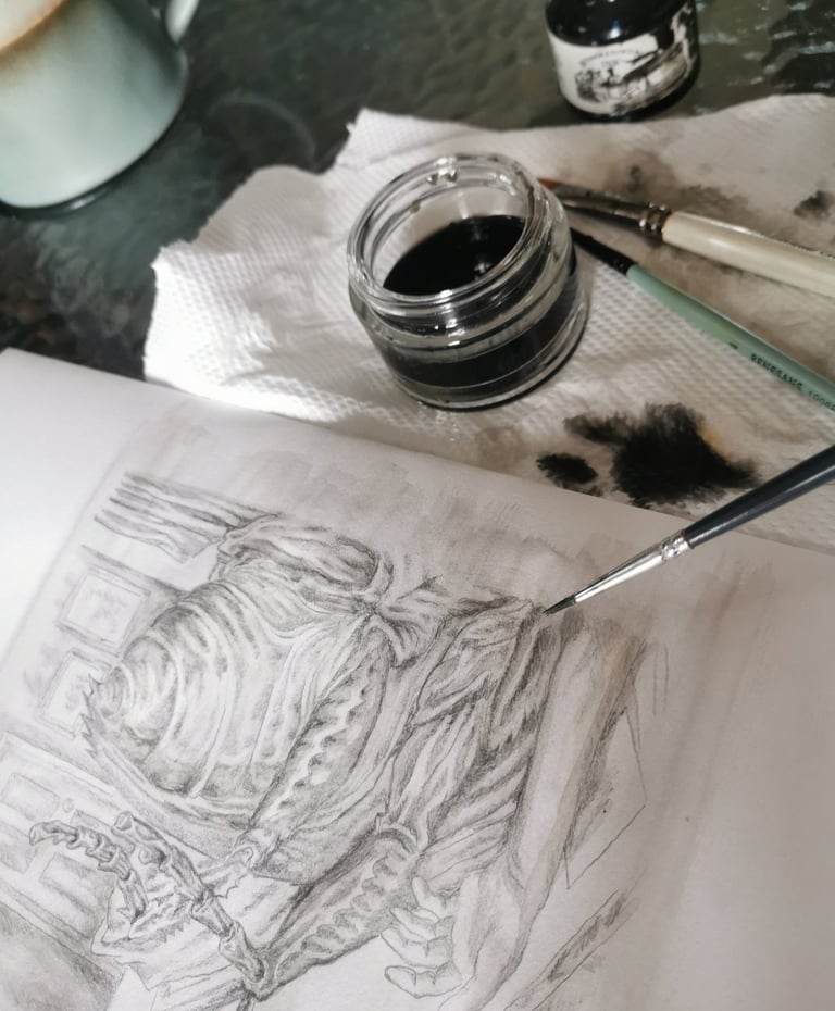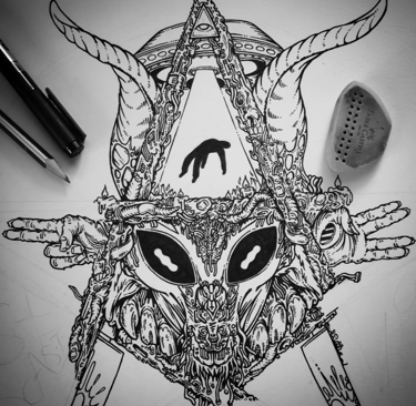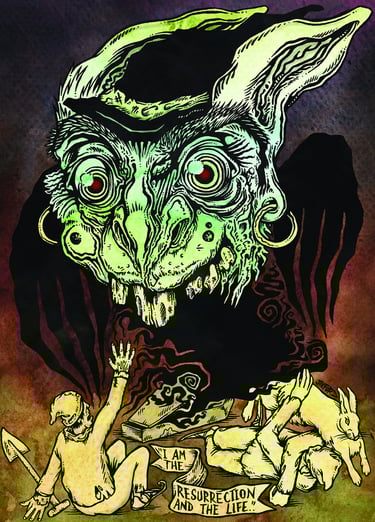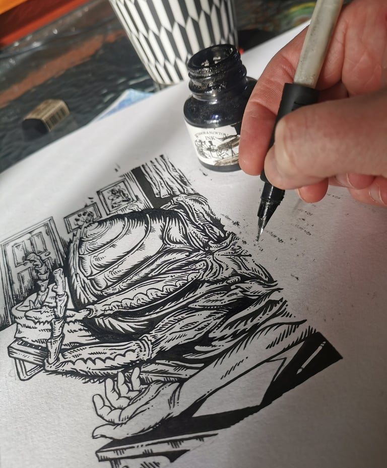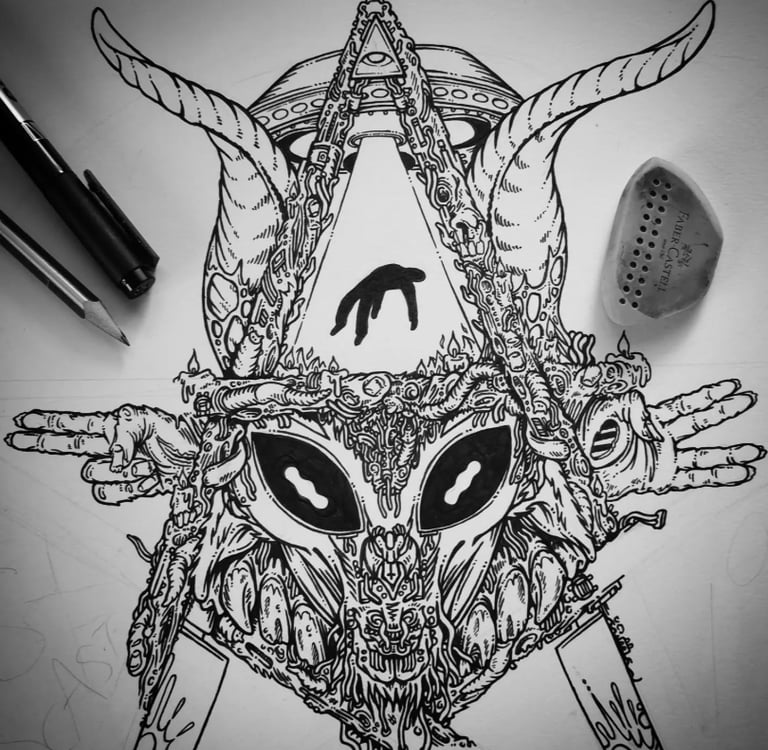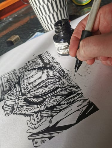 The design was creatued using pigment ink on 200 gsm paper and digitally coloured using a variety of professional brushes. The drawing was then developed into a complex animation to be used on social media and sent to both the podcast and the comics publisher. The design was creatued using pigment ink on 200 gsm paper and digitally coloured using a variety of professional brushes. The drawing was then developed into a complex animation to be used on social media and sent to both the podcast and the comics publisher for promotion.